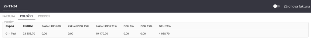 Nově vytvořená faktura se automaticky zobrazí v hlavní tabulce v modulu Faktury. Po otevření detailu faktury na kartě „Položky“ se uživateli zobrazí všechny SO z vybraných protokolů, které byly zahrnuty do faktury.