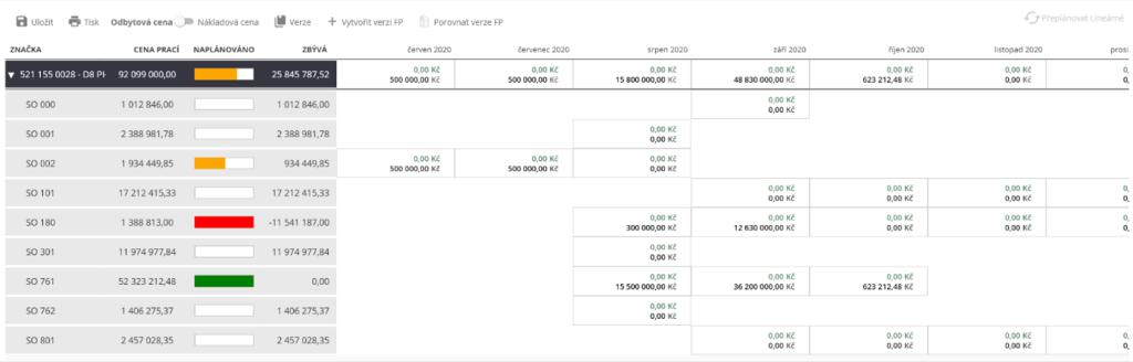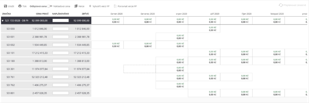 Tento modul slouží pro plánování financování jednotlivých stavebních objektů na stavbě a následné porovnání s reálným. Každý řádek v tabulce představuje stavební objekt případně podobjekt stavby.