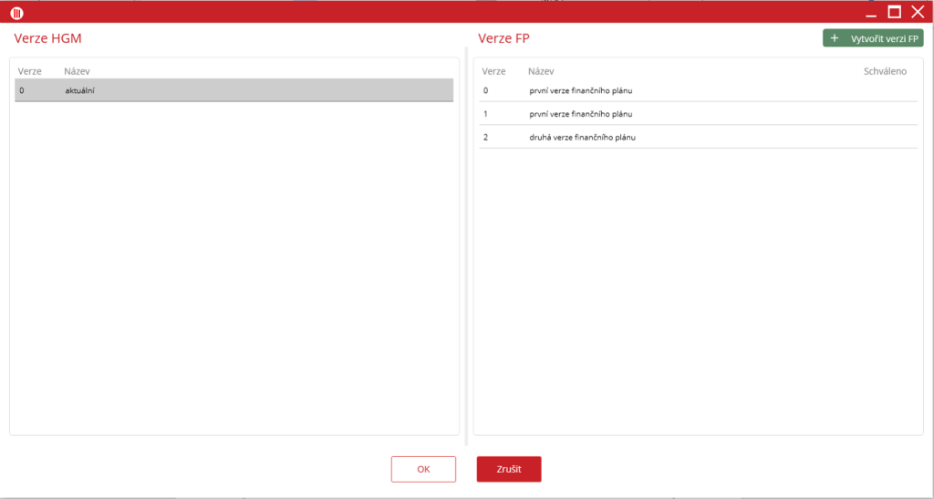 V okně verzí uživatel zvolí verzi harmonogramu a následně i verzi finančního plánu, kterou chce zobrazit. Výběr lze potvrdit tlačítkem „OK“ dole nebo dvojklikem na verzi finančního plánu.