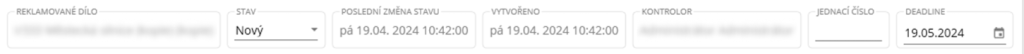 Pole „Stav“ slouží pro výběr stavu reklamace. Uživatel také může zadat jednací číslo reklamace nebo deadline. Všechna tato pole se nachází v horní části obrazovky.