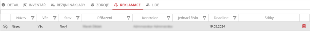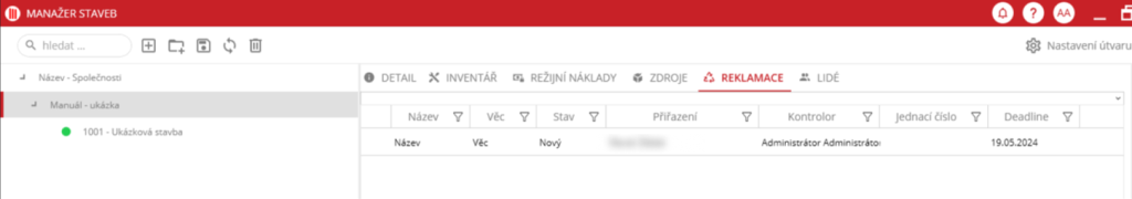 Reklamace lze otevřít skrze kartu Reklamace, která je k nalezení v hlavní části obrazovky při označení útvaru ve stromovém zobrazení staveb na obrazovce Manažer staveb. Po kliknutí na kartu se uživateli zobrazí tabulka se všemi reklamacemi na daném útvaru. Po najetí kurzorem myši na řádek s reklamací se zobrazí vlevo ikona oka . Otevření uživatel provede kliknutím na ikonu nebo dvojklikem na daný řádek.