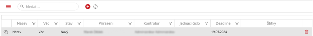 Po otevření modulu uživatel uvidí tabulku s reklamacemi na dané stavbě. Po najetí kurzorem myši na řádek s reklamací se zobrazí vlevo ikona oka . Otevření uživatel provede kliknutím na ikonu nebo dvojklikem na daný řádek.
