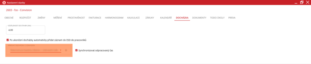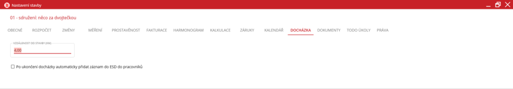 Na kartě Docházka uživatel může zapsat vzdálenost v kilometrech. Tato vzdálenost určuje, jak daleko od stavby může zaměstnanec zapínat/vypínat svoji docházku. Aby tato funkce fungovala, je nutné, aby stavba měla nastavené umístění na mapě a aby uživatel měl v mobilní aplikace povolené polohové služby.