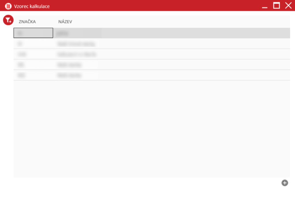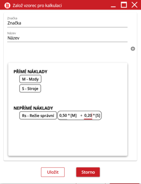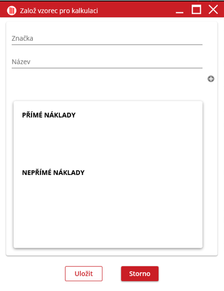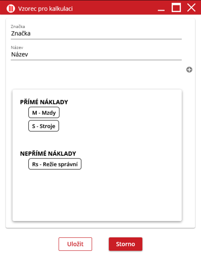 Po kliknutí na danou ikonu se otevře nové okno. Uživatel zde zadá značku a název vzorce. Nyní uživatel potřebuje přidat do vzorce náklady kalkulace. Tato operace lze provést kliknutím na tuto ikonu .