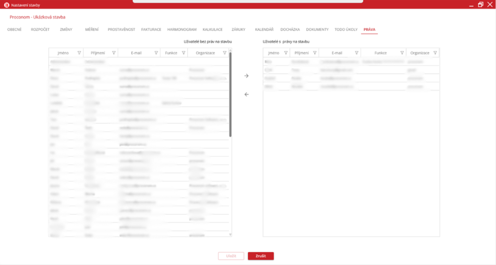 Nastavení práv na kartě “Práva“ slouží k nastavení viditelnosti stavby pro jednotlivé uživatele s jejich emailovou adresou. V levém sloupci se nachází seznam uživatelů, kteří tuto stavbu neuvidí. V pravém sloupci se nachází uživatelé, kteří stavbu uvidí a mohou s ní pracovat.