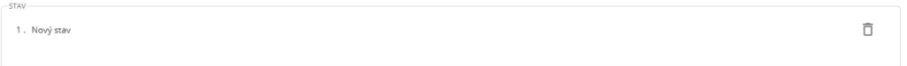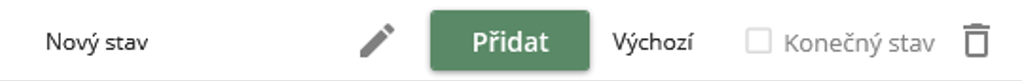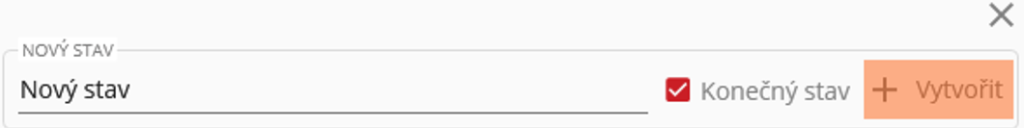 . V nově zobrazeném dialogovém okně uživatel začne psát název typu do pole “Nový stav“. Po zapsání názvu uživatel checkboxem zvolí, zda se jedná o konečný stav. Poté potvrdí přidání stavu do seznamu pod polem tlačítkem “Vytvořit“ v pravé části pole. Stav se nyní objeví v seznamu typů pod polem.