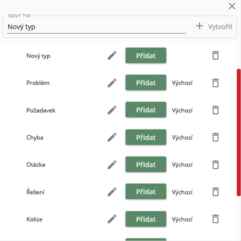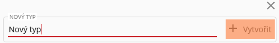 . V nově zobrazeném dialogovém okně uživatel začne psát název typu do pole “Nový typ“. Po zapsání názvu uživatel potvrdí přidání typu do seznamu pod polem tlačítkem “Vytvořit“ v pravé části pole. Typ se nyní objeví v seznamu typů pod polem.