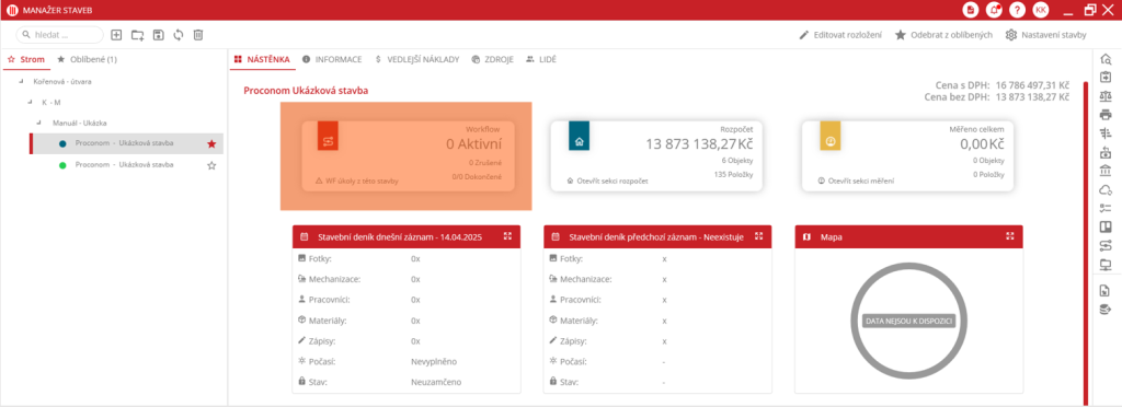 Ve stromovém zobrazení uživatel zvolí jedním kliknutím stavbu. Ve střední části obrazovky se objeví Nástěnka (Dashboard) stavby. V ní se nachází grafické zobrazení různých modulů stavby. Po nalezení panelu Workflow v levé horní části nástěnky stačí kliknout na červený praporek na panelu. Otevře se modul Workflow pro tuto zvolenou stavbu.