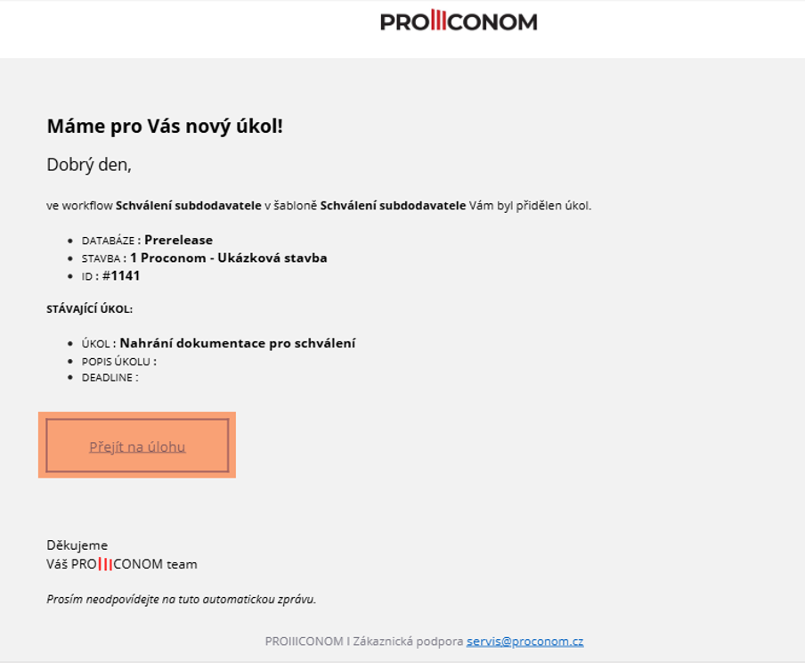 s názvem „Přejít na úlohu“. Kliknutím na tento odkaz se přesměruje do webové aplikace, kde se může přihlásit a zobrazit podrobnosti o úkolu. Pokud se na kroku nachází připomínky od informovaných osob, tak budou v emailu vypsány.