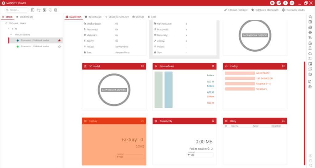 Ve stromovém zobrazení uživatel zvolí jedním kliknutím stavbu. Nyní se ve střední části obrazovky objeví Nástěnka (Dashboard) stavby. V ní se nachází grafické zobrazení různých modulů stavby. Zde je sekce Faktury ve třetím řádku nástěnky vlevo. Kliknutím na ikonu šipek vpravo od nadpisu panelu lze otevřít modul pro zvolenou stavbu.
