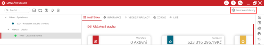 Nastavení stavby uživatel otevře v okně Manažer staveb. Stavba, kde chce uživatel otevřít nastavení musí být zvolena v levé části obrazovky. Tlačítko “Nastavení stavby“ se nachází v pravé horní části obrazovky s ikonou ozubeného kola.