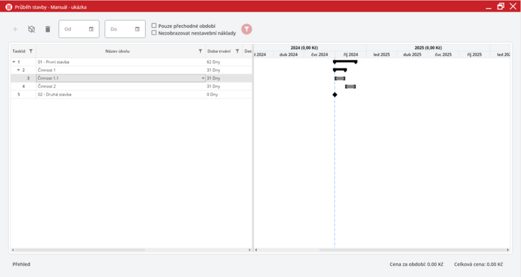 Nástroj „Plán průběhu staveb“ slouží pro zobrazení plánovaného období výstavby v čase. Funkce podporuje i plánování nákladů.