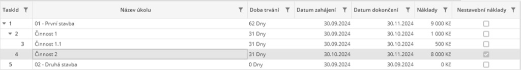 V levé části se nachází tabulka obsahující stavby a k nim přiřazené činnosti. Každá stavba může obsahovat dvě úrovně činností. Uživatel může úroveň zobrazit či skrýt kliknutím na ikonu šipky  v dané úrovni.