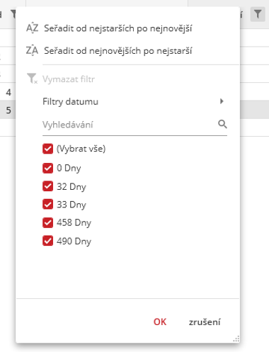 V tabulce lze filtrovat kliknutím na ikonu trychtýře vpravo u názvu sloupce. Takto uživatel může filtrovat zobrazovaná data v tabulce.