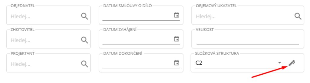 Do tohoto okna se dostane skrze ikonu plus nad seznamem staveb. V novém dialogovém okně je zapotřebí nalézt ikonu tužky u složkové struktury a tu stisknout.