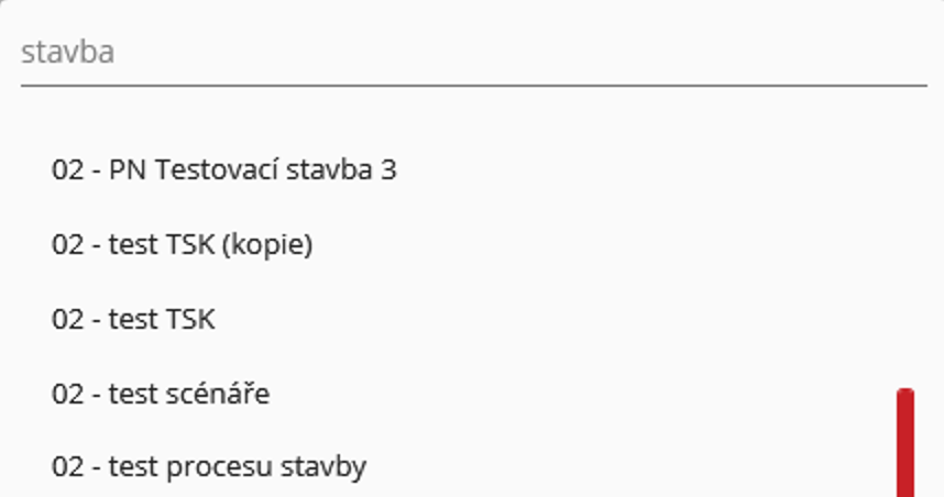 Kliknutím na pole „stavba“ se zpřístupní vyhledávací pole, kde uživatel může vyhledat požadovanou stavbu.