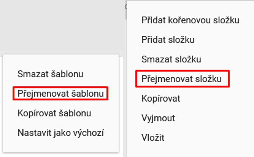 Pro přejmenování šablony či složky je zapotřebí, aby uživatel zvolil levým tlačítkem myši cíl pro přejmenování. Nyní uživatel nad zvoleným cílem vyvolá kontextové menu stisknutím pravého tlačítka myši. V menu vybere možnost „Přejmenovat šablonu“ nebo „Přejmenovat složku“.