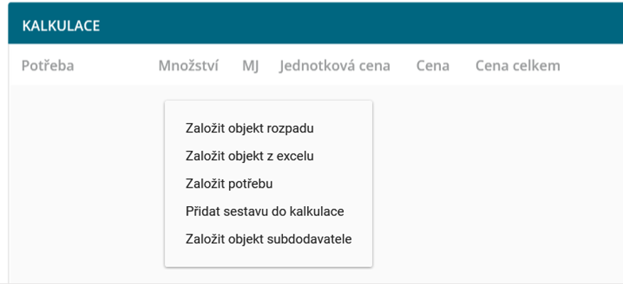 Potřebu lze založit samostatně nebo v objektu rozpadu. Otevře se formulář, kde je nutné vybrat položku kalkulačního vzorce (př. hmoty, mzdy, stroje, …) a konkrétní potřebu. Zbytek polí se automaticky dotáhne z číselníku.