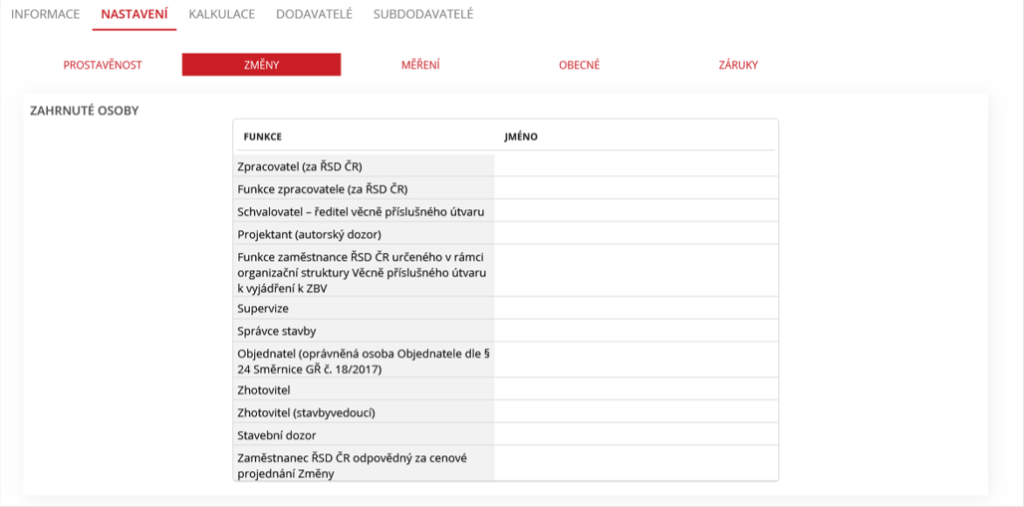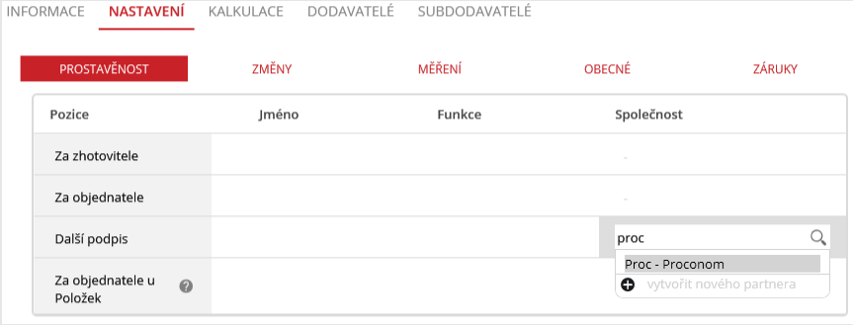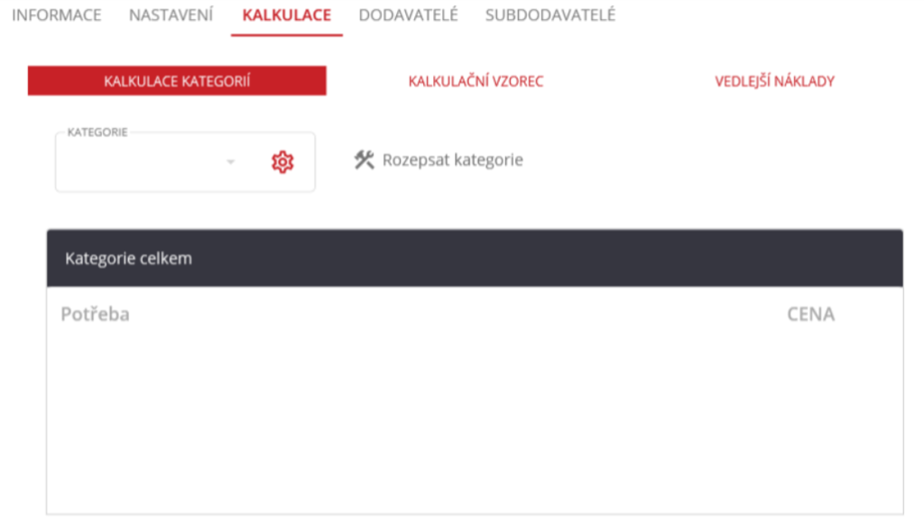 V hlavní části obrazovky (prostřední) nahoře jsou tyto záložky: Informace, Nastavení, Kalkulace, Dodavatelé, Subdodavatelé.