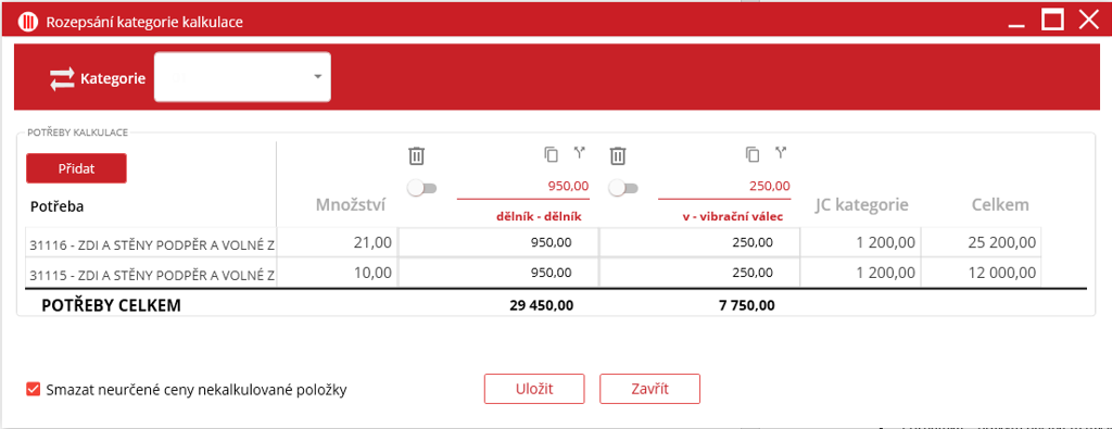 Kalkulaci je možné vyplnit i hromadně. Jednotlivé položky lze přiřadit do kategorií dle MJ.
