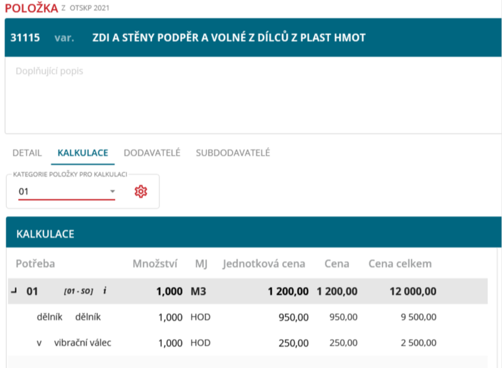 Tvorba kalkulace položky