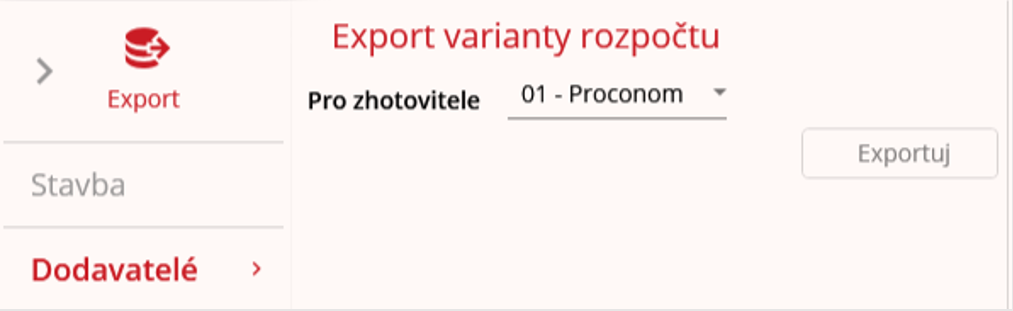 V pravém menu okna pro export je nutno kliknout na záložku “Dodavatelé“. Uživatel zvolí, pro jakého zhotovitele ze sdružení se rozpočet exportuje. Poté zmáčkne tlačítko “Exportuj“ a zvolí, kam se soubor uloží ve jeho zařízení.