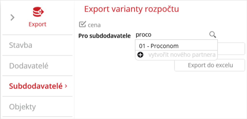 V pravém menu okna pro export uživatel klikne na záložku “Subdodavatelé“. Pod názvem widgetu nalezne checkbox, který určí, zda se rozpočet vyexportuje s cenami či bez nich. Uživatel zvolí, pro jakého subdodavatele rozpočet exportuje ikonou lupy, nebo psaním do pole vlevo od lupy. Našeptávač bude zobrazovat nejbližší výsledky k psanému textu. Pro zvolení stačí kliknout do našeptávače na hledaného subdodavatele.