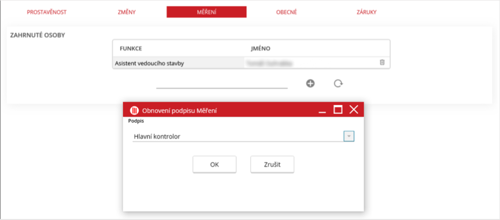 Na kartě je zobrazena tabulka s podpisy, které se budou týkat modulu Měření. Do volného řádku uživatel napíše funkci a klikne na ikonu plus pro přidání funkce do tabulky, Nyní k funkci lze dopsat jméno osoby s danou funkcí. V řádku každého podpisu je ikona popelnice pro smazání.