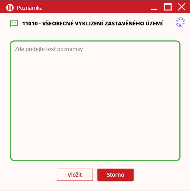 Uživatel najde položku ve stromovém zobrazení, ke které chce přidat poznámku. Klikne na ni pravým tlačítkem myši. V kontextovém menu zvolí možnost “Přidat poznámku“. V novém okně lze zapsat do pole svou poznámku. Pokud chce uživatel změnit barvu poznámky, tak klikne na ikonu palety v pravém horním rohu a zvolí jinou barvu. Úpravy se dokončí tlačítkem “Vložit“ ve spodní části obrazovky. Tlačítko “Storno“ změny zahodí.