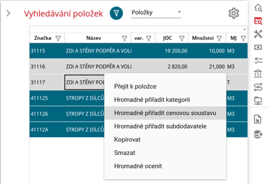 Další možností je zvolit hromadnou úpravu a tu uskutečnit pomocí widgetu “Vyhledávání položek” kde lze vybrat položky, které je třeba změnit a v kontextovém menu vybrat možnost “Hromadně přiřadit cenovou soustavu”.