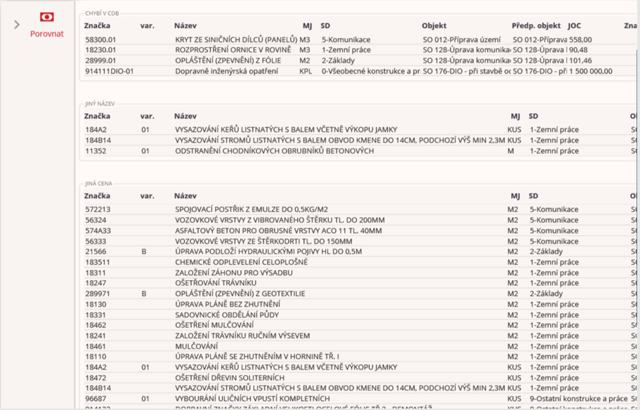 Po kliknutí na ikonu se zobrazí ovládání nástroje. V comboboxu “Cenová databáze“ uživatel zvolí databázi, která bude porovnávána s vaším rozpočtem. Po zvolení se chvíli budou načítat data a zobrazí se vyplněné tabulky s vypsanými odlišnostmi.