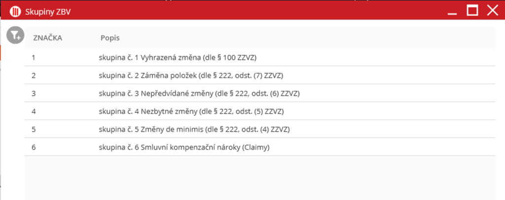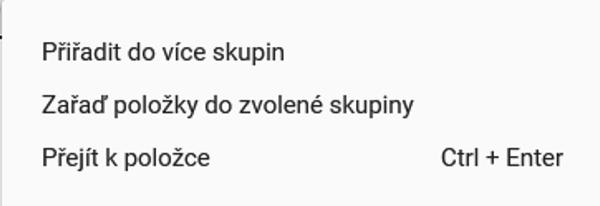 “Zařaď položky do zvolené skupiny“ je funkce, kde lze držením klávesy Shift nebo Ctrl a kliknutím do tabulky zvolit vícero položek, a lze je hromadně přiřadit do jedné skupiny. Skupinu v novém okně lze vybrat dvojklikem na její řádek.