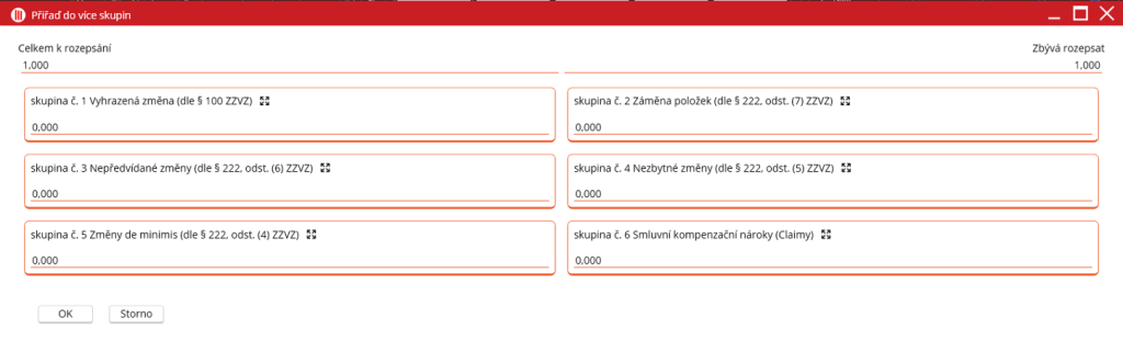 “Přiřadit do více skupin“ otevře nové okno, kde může uživatel rozepsat množství změny do více skupin najednou. Dokončení změn potvrdí zmáčknutím tlačítka OK.