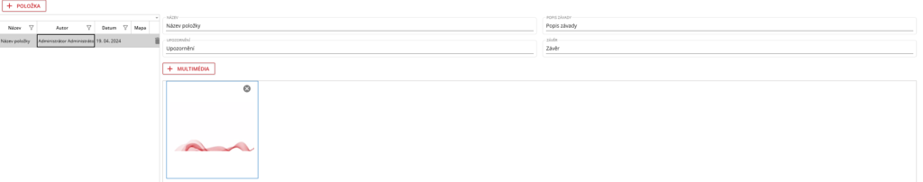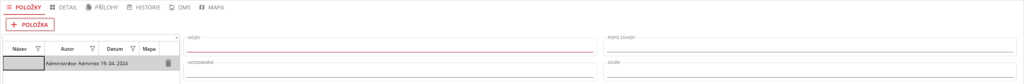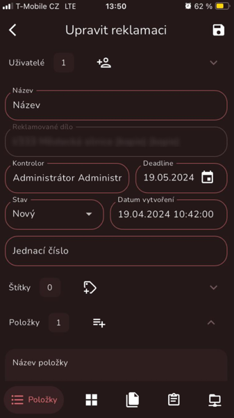 Nyní se uživatel nachází v okně detailu reklamace. Pro přiložení fotek s metadaty je zapotřebí otevřít/založit položku v comboboxu „Položky“ ve spodní části obrazovky. Po nalezení/vytvoření položky je na ni nutno kliknout.