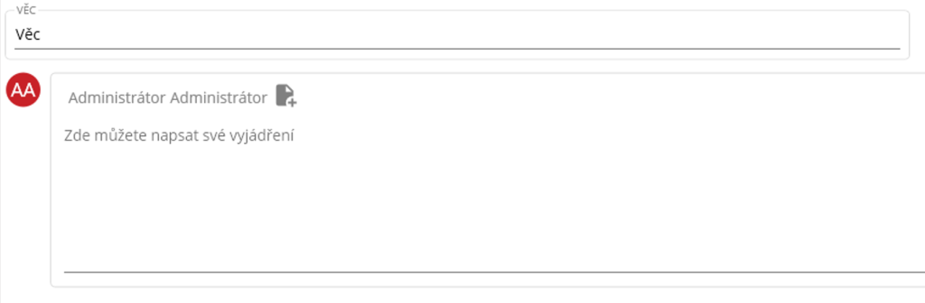 Na této kartě slouží pole „Věc“ pro popis reklamace. Pod tímto polem se nachází pole, kde uživatel může zapsat své vyjádření k reklamaci a popřípadě přidat soubor skrze tuto ikonu . Pod tímto polem se nachází v případě jiných vyjádření zobrazují jejich detaily.