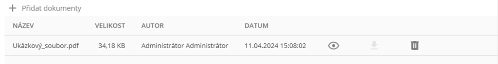 Po nahrání dokumentu se soubor zobrazí v tabulce, kde lze stáhnout, zobrazit nebo smazat.