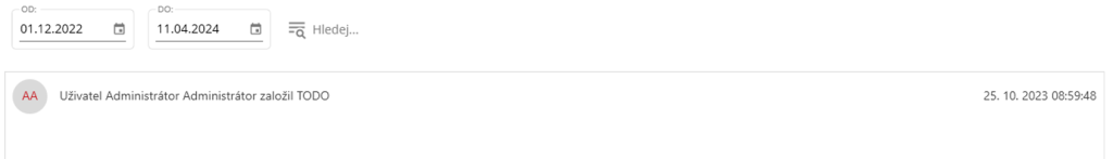 Na této kartě uživatel nalezne dvě pole pro zadání startu a konce hledání. Po kliknutí na tlačítko „Hledej“  se toto datové rozmezí prohledá a program vypíše v seznam pod daty veškeré akce, které v tomto období probíhali.