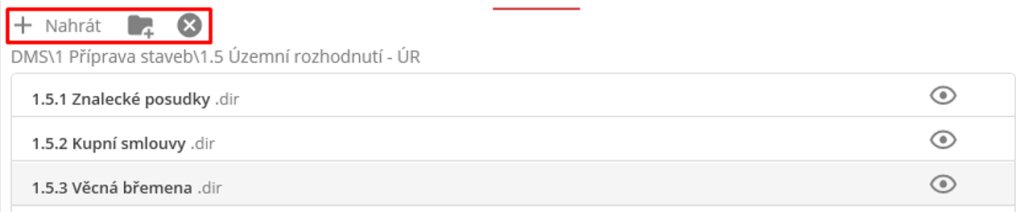 Po připojení složky lze přepárovat složku stejnou ikonou. Také lze tlačítkem „Nahrát“ přidat do této DMS složku nový soubor. Celá napárovaná složka se odpáruje kliknutím na ikonu křížku.