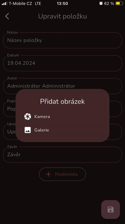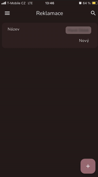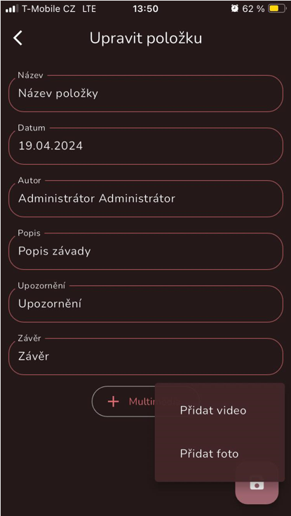 Nyní uživatel vidí okno detailu položky reklamace. Pro zahájení focení je zapotřebí kliknout na tlačítko „Multimédia“ s ikonou plus ve spodní části obrazovky.