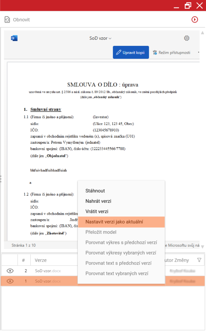 V tabulce verzí je zapotřebí, aby uživatel vyhledal požadovanou historickou verzi dokumentu. Kliknutím pravým tlačítkem myši na vybranou verzi se uživateli otevře kontextové menu. V menu se nachází možnost „Nastavit verzi jako aktuální“. Kliknutím na možnost se dokument nahraje jako nová verze bez smazání verzí, které se původně nacházeli před ní.