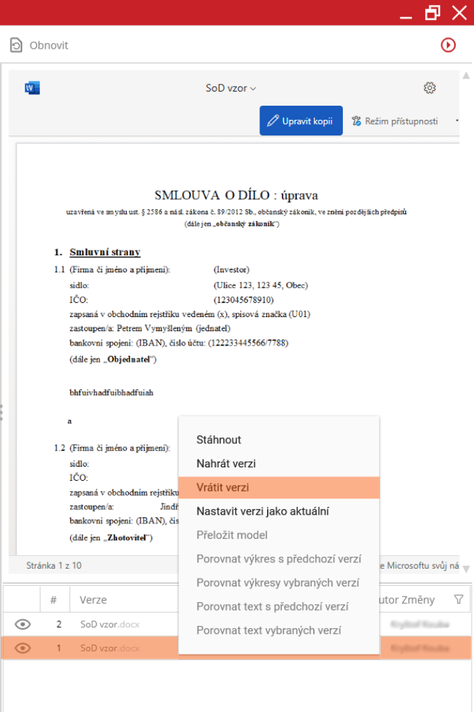 V tabulce verzí vyhledejte požadovanou historickou verzi, otevřete její kontextové menu a zvolte možnost „Vrátit verzi“. Tím dokument obnovíte do vybrané historické verze.