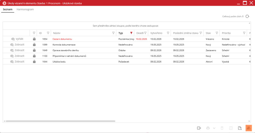 Typ – V tomto sloupci je k nalezení typ/druh elementu, na kterém je úkol založen. (stavba, položka, stavební deník atd.)
