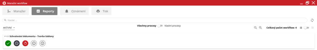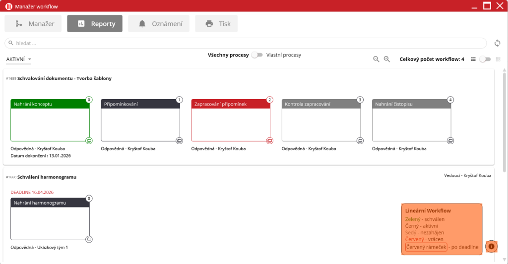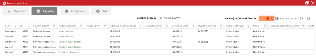 Na střední úrovni obrazovky je přepínač mezi “Všemi procesy“ a “Vlastními procesy“, kde uživatel figuruje jako vedoucí procesu.