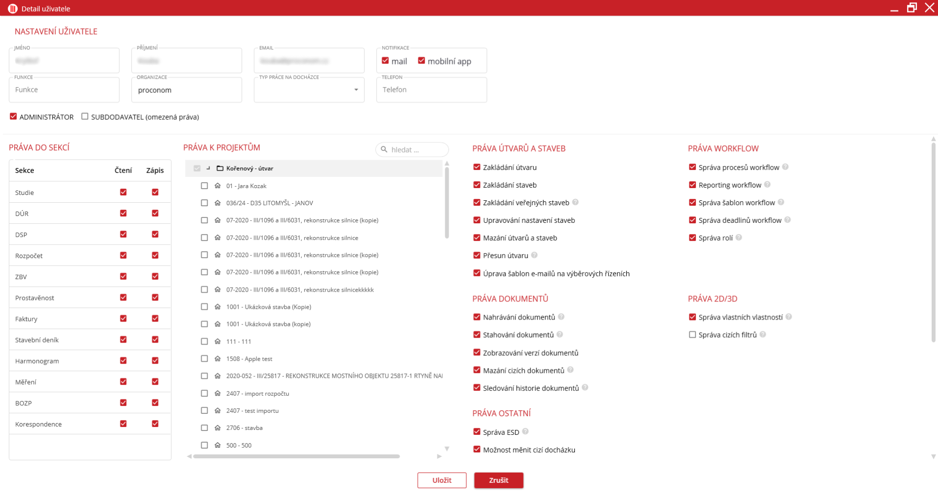 Práva do sekcí, které se nacházejí v levé části obrazovky, upravují, jaké moduly upravovaný uživatel vidí (čtení) a se kterými může pracovat (zápis). Zaškrtnuté pole znamená, že je daný sloupec povolen. Odškrtnuté znamená, že je sloupec nepovolen. Pokud jsou oba sloupce modulu zakázány, tak je lze hromadně označit kliknutím do checkboxu sloupce Zápis. Pokud jsou povoleny, tak je uživatel odznačení kliknutím na checkbox Čtení.