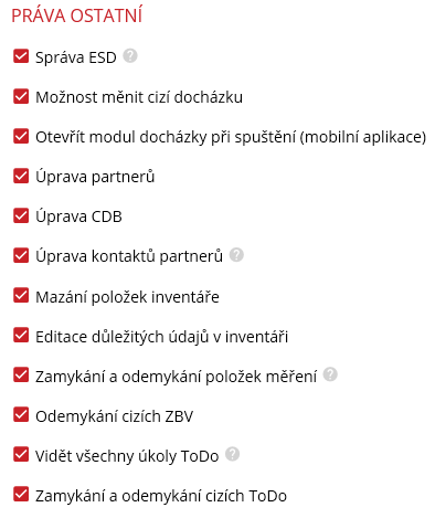 V této části budou rozepsána práva, která nezapadají do ostatních částí. U složitějších práv jsou za názvem ikony s otazníkem. Po najetí kurzorem na otazník a počkání se zobrazí nápověda, co daná možnost znamená.