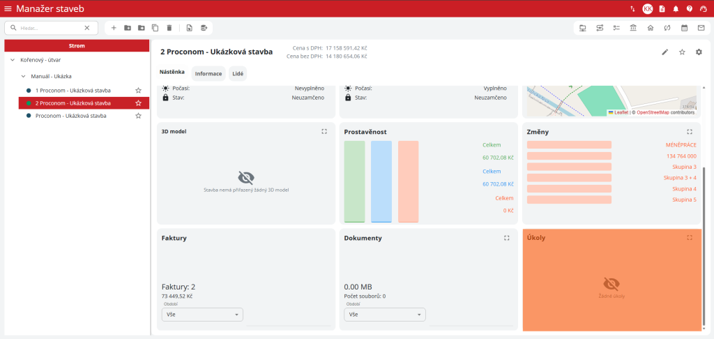 Ve stromovém zobrazení uživatel zvolí jedním kliknutím stavbu. Ve střední části obrazovky se objeví Nástěnka (Dashboard) stavby. V ní se nachází grafické zobrazení různých modulů stavby. Po nalezení panelu Úkoly, v pravé dolní části nástěnky, stačí dvakrát kliknout na dlaždici. Otevře se modul Úkoly pro tuto zvolenou stavbu.