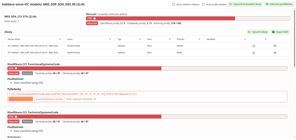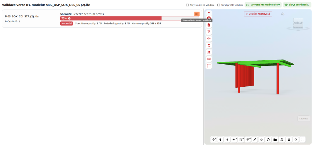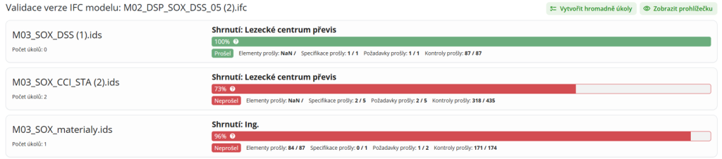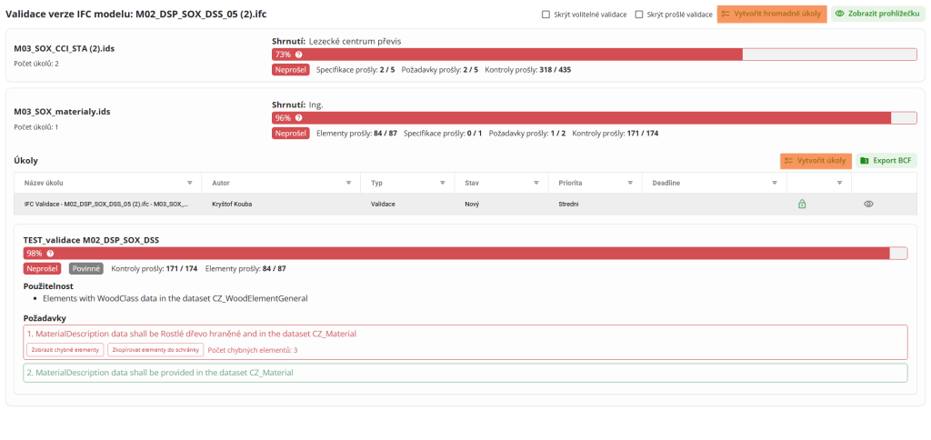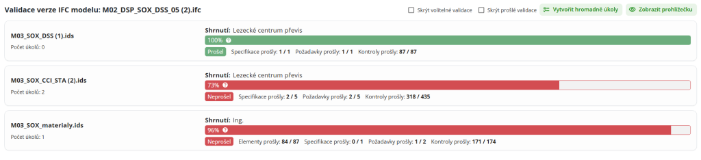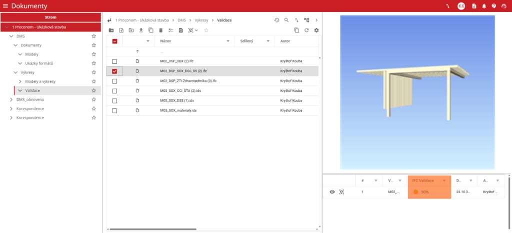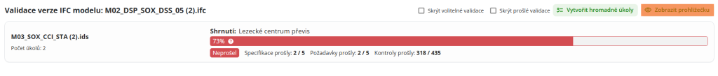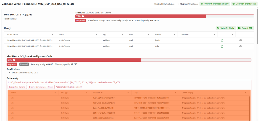 V části seznamu verzí nalezne uživatel výsledek validace ve sloupci „IFC Validace“. Kliknutím na výsledek uživatel zobrazí nové okno s výsledkem