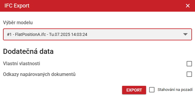 Tato část je věnovaná exportování modelu, který je otevřen z modulu Rozpočet: Export umožňuje tlačítko s šipkou směrem dolů v levém panelu. Jedná se o export IFC souboru.  Po kliknutí na tlačítko je za potřebí zvolit exportovaný model a zvolit, zda se mají exportovat, vlastní metadata, rozpočet a harmonogram.