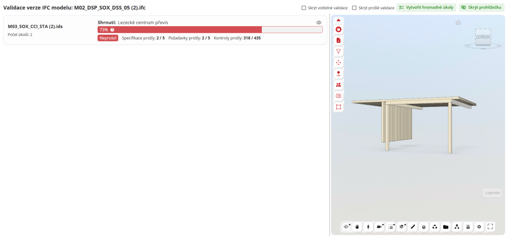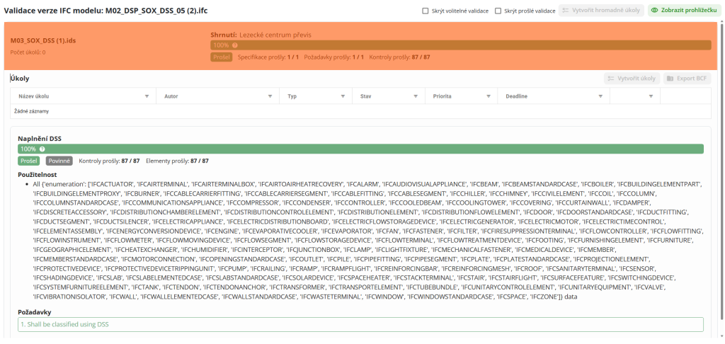 Tato funkce slouží k validaci modelu ve formátu IFC, podle předem vytvořeného a nadefinovaného souboru IDS. Dle vytvořených požadavků IDS souboru se zvalidují všechny negrafické informace modelu. Díky výstupních hodnot uživatel zjistí, zda se například v modelu nenacházejí jiné atributy, nebo zda není model jinak strukturovaný.