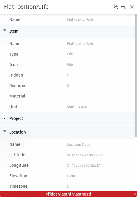 V novém okně uživatel nyní vidí vlastnosti zvoleného prvku modelu. Ve spodní části obrazovky uživatel nalezne tlačítko „Přidat vlastní vlastnosti“.